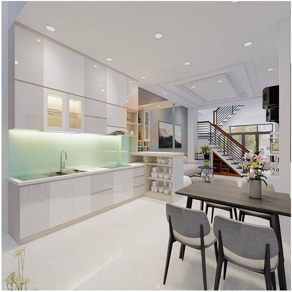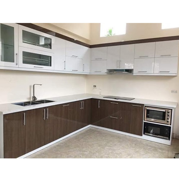 - Mẫu mã phong phú, dễ thi công: Lớp phủ Melamine có nhiều lựa chọn về màu sắc và vân trang trí, giúp tủ bếp dễ dàng hòa hợp với nhiều phong cách nội thất, đồng thời thuận tiện trong quá trình gia công.